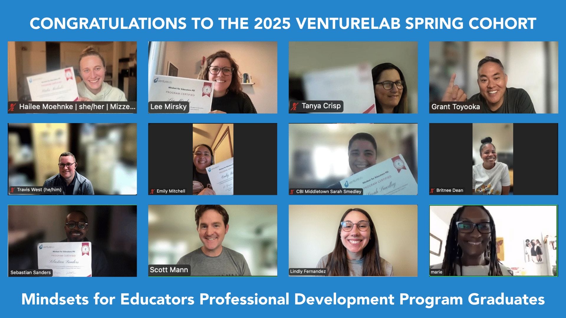 “Professional development is personal development. Any major shift I’ve made in my approach to teaching and learning has involved realizations about myself. That is the goal of the VentureLab Mindset for Educators Professional Development Program. We create a safe space for adults who are in positions of authority, within a classroom or an organization, to be vulnerable, to practice, share with peers, and grow. Even if they work on a professional challenge, it’s the personal growth they experience over the 8-weeks and the relationships they form within their cohort that is the real impact.”